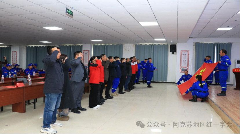 活动在庄严国歌声中启幕,筹备组汇报了队伍组建、人员招募与专业培训等筹备情况,获与会人员认可。地区红十字会领导致贺词,强调救援队作为政府应急体系的重要辅助力量,将为本地应急救援事业注入新动能。随后,宣读成立批复,授旗授牌仪式庄重举行,队员高举右拳宣誓践行“少说多做,默默奉献,完善自我,善待他人”队训,参加活动的全体党员同步重温入党誓词,以党建引领公益救援。