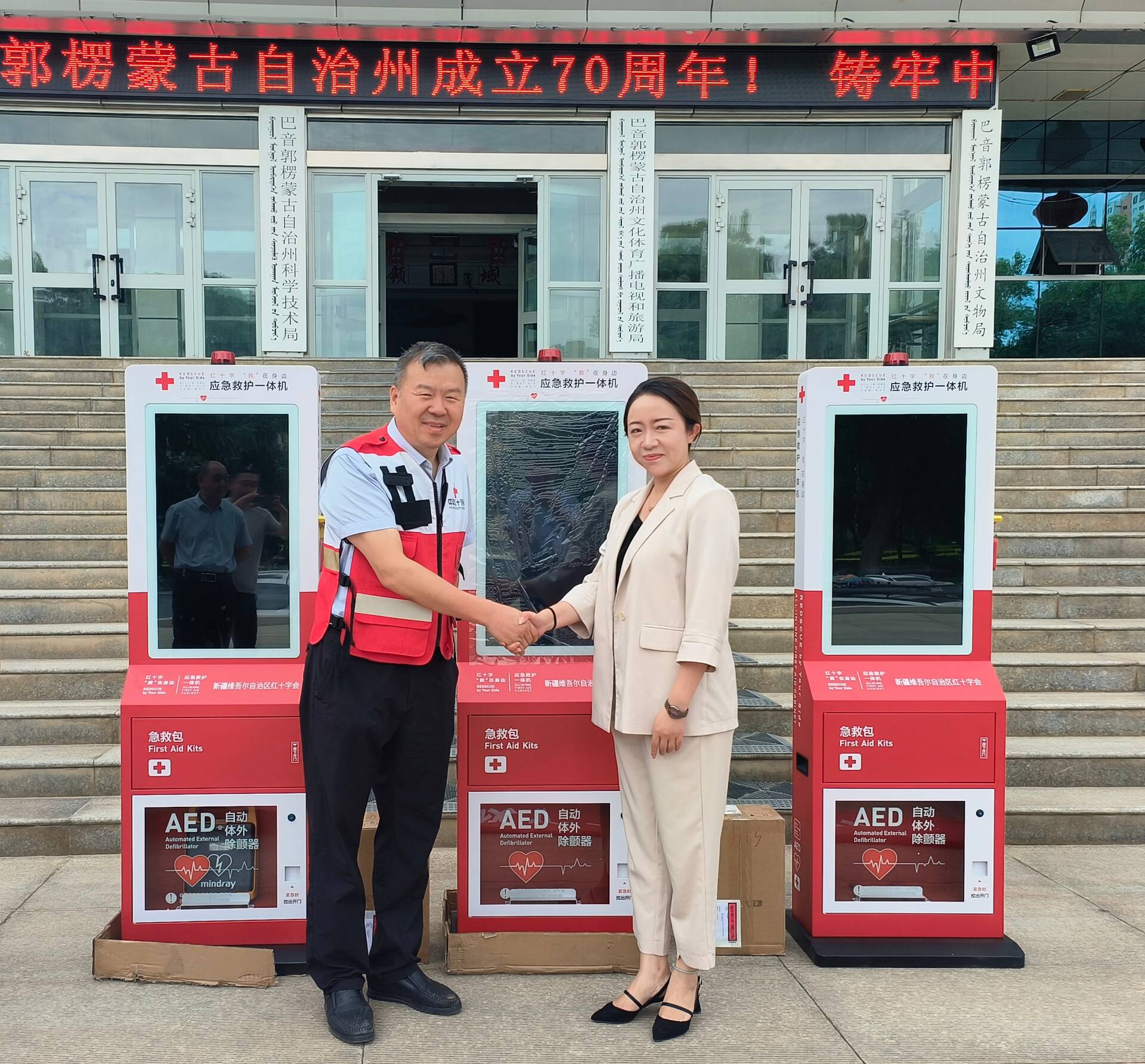 巴州红十字会向巴州纪委监委、巴音郭楞融媒体中心和中交新疆交通投资发展有限公司投放3台应急救护一体机,至此,全州应急救护一体机及自动体外除颤仪(AED)已增至25台。