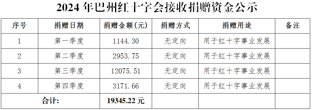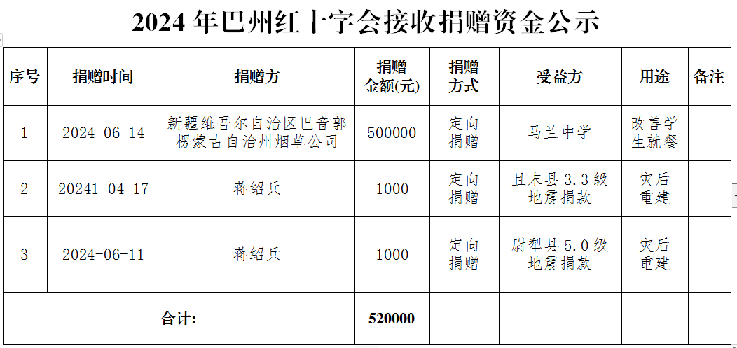 2024年1月1日至12月31日,州红十字会共收到爱心企业、爱心人士捐赠资金52.14万元。其中:巴音郭楞蒙古自治州烟草公司定向捐赠资金50万元,爱心人士蒋绍兵定向捐赠资金0.2万元,爱心人士王修权、朱政杰、文来胜、孙纪荣、笪沛盛、马全存等非定向捐赠资金1.934522万元。