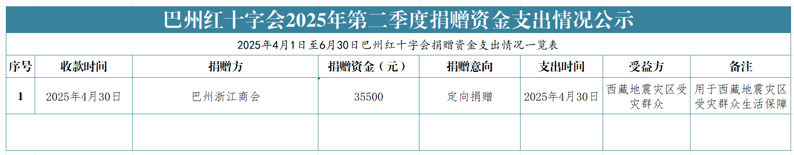 为深入贯彻落实《中华人民共和国红十字会法》《中华人民共和国公益事业捐赠法》《中华人民共和国慈善法》《中国红十字会信息公开标准》,打造公开透明的红十字会,现将巴州红十字会2025年第二季度捐赠资金支出情况公示如下: