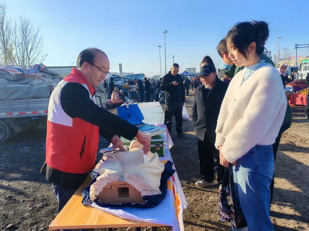 为践行“人民至上、生命至上”理念,普及应急救护知识,提升农村居民应急能力,近日,昌吉市红十字会携手苏玉琴志愿者服务工作站,在大西渠镇幸福村集贸市场的百姓大舞台上,开展了一场生动的心肺复苏培训活动。