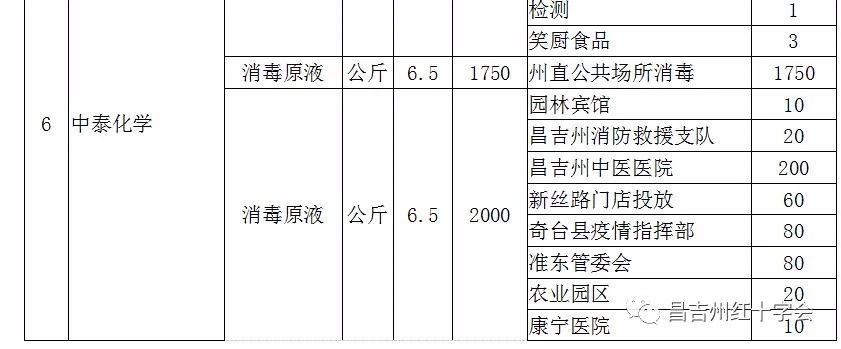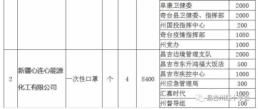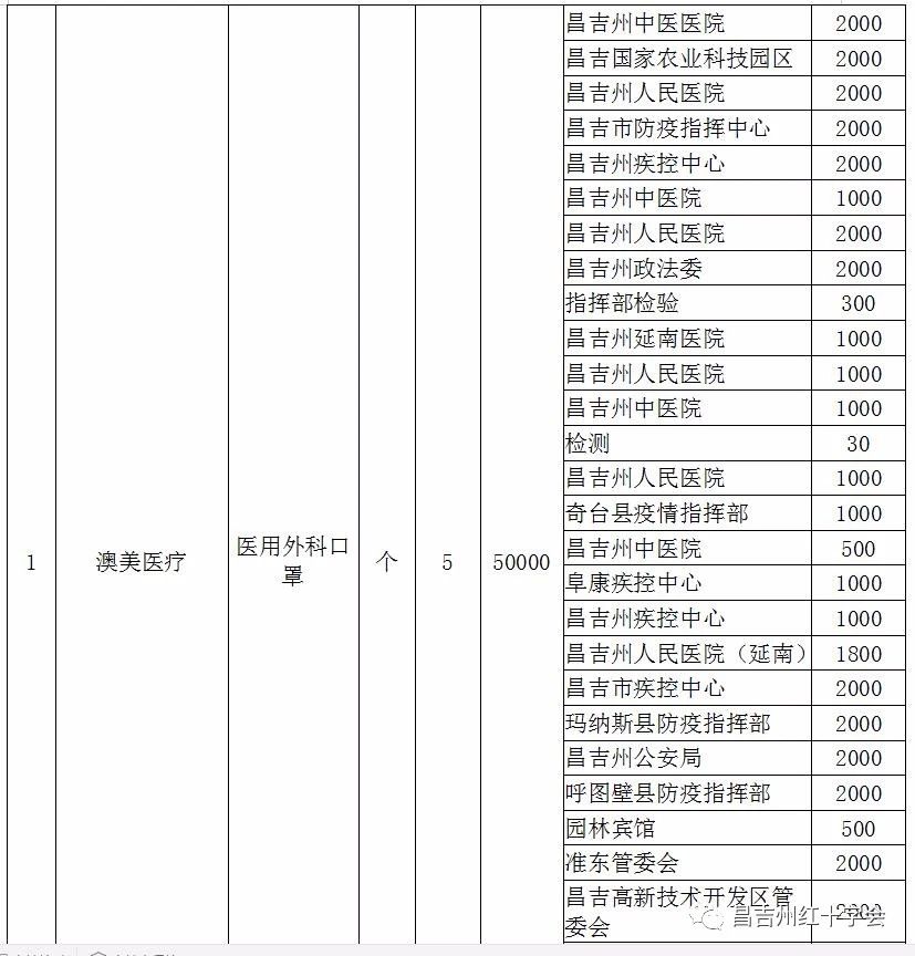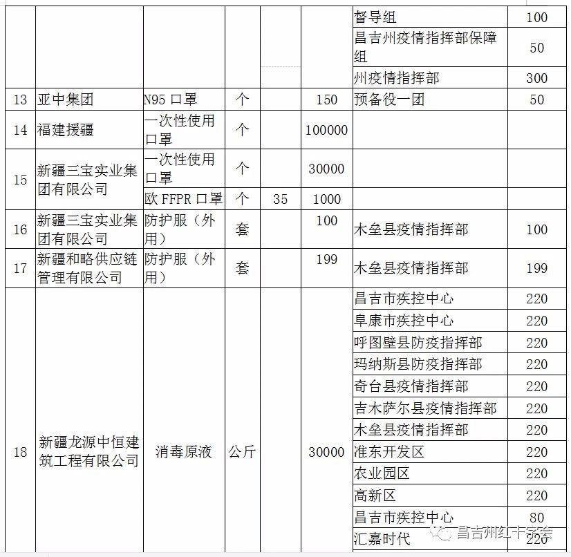 现将昌吉州新冠肺炎疫情防控工作指挥部接受社会捐赠物资第一批分配情况公示如下: