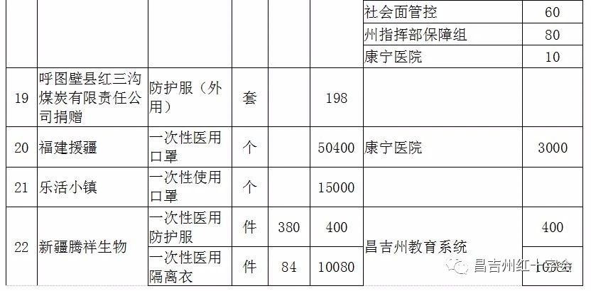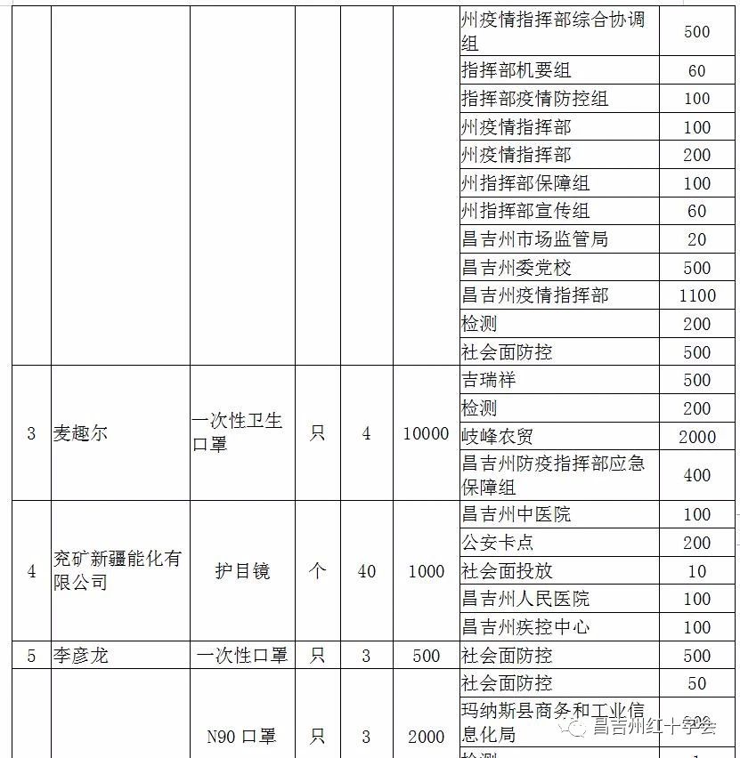 昌吉州新冠肺炎疫情防控工作指挥部发放捐赠物资统计表