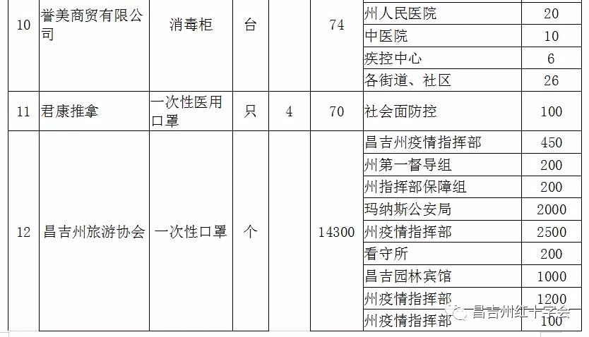 昌吉州新冠肺炎疫情防控工作指挥部发放捐赠物资统计表