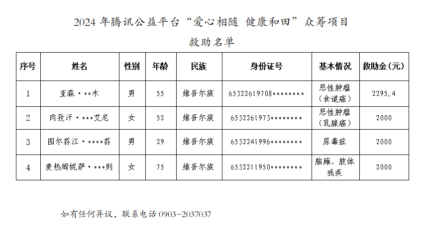 2024年和田地区红十字会在腾讯公益平台上线的“99公益日”“爱心相随 健康和田”众筹项目筹款总额8295.4元(其中7923.45元是爱心网友捐款,371.95元是公益平台项目配捐)。互联网众筹项目已结束筹款,经会议审议通过所有筹款8295.4元,用于“爱心相随 健康和田”项目申请患者的救助。按平台设计救助标准,经个人申请、材料审核、综合评定等规范流程,现对4名符合条件的患者进行资助。旨在确保项目执行的公开透明,接受社会各界监督,推动公益救助工作持续健康发展。现将资助名单公示如下: