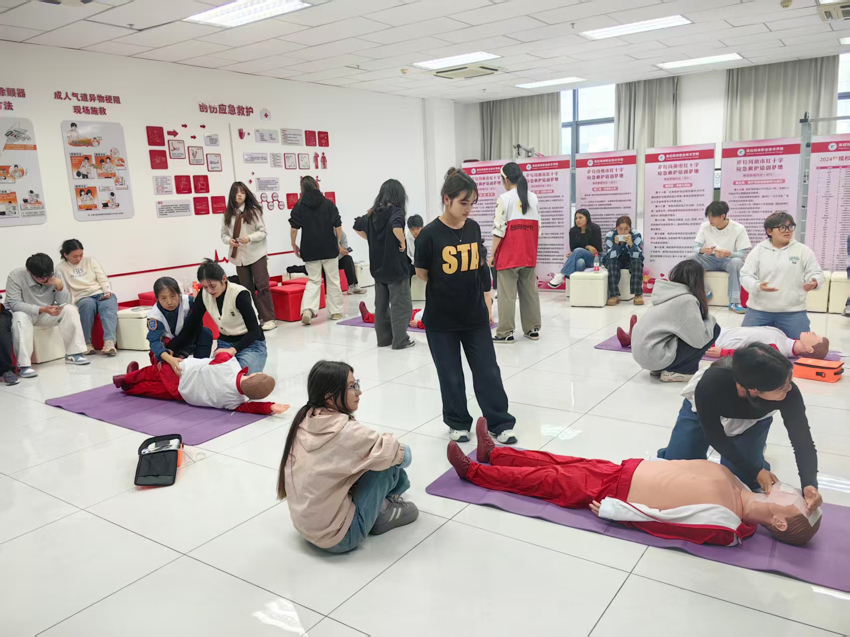 为进一步普及应急救护知识,提升在校大学生的安全防范意识和自救互救能力,近期,克拉玛依市红十字会依托设立于克拉玛依职业技术学院的应急救护培训基地,连续为克拉玛依职业技术学院不同专业、年级的学生组织开展了救护员取证培训,取得了扎实成效。