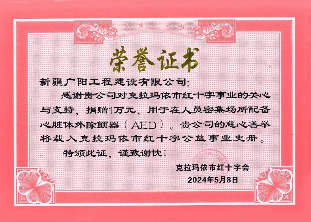 2024年5月8日上午新疆广阳工程建设有限公司向克拉玛依市红十字会捐赠1万元用于在人员密集场所配备心脏体外除颤仪(AED)。为有效助力我国急救体系完善,推动社会公众急救能力提升,达到“会救、愿救、敢救、能救”的目标。