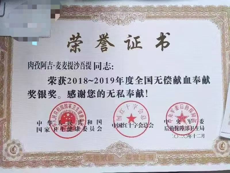 肉孜江的献血证已经攒了厚厚一摞,但他最珍视的,是2023年那枚全国无偿献血奉献奖银奖奖章。这不仅是对他十年坚持的肯定,更是一份沉甸甸的鞭策。