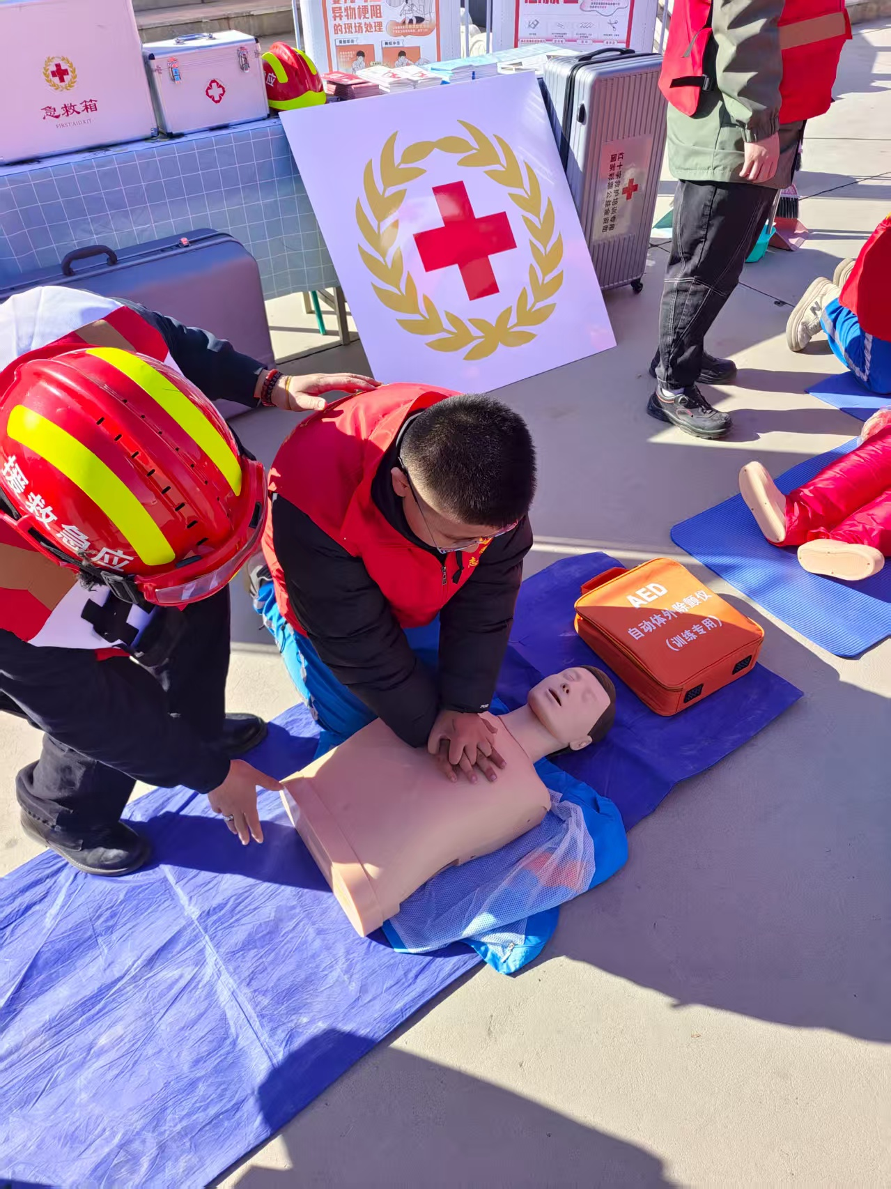 红十字应急救援队的队员们化身 “摊主”,结合 11 月秋冬季节特点,重点讲解了火灾逃生中的自救互救、低温冻伤急救、意外跌倒处理等实用知识。而最受关注的,仍是心肺复苏术(CPR)和海姆立克急救法的现场演示。“遇到有人晕倒,先判断环境安全,再拍打他的肩膀喊‘你还好吗’,如果没反应、没呼吸,就要立刻拨打 120,同时开始做心肺复苏!” 队员一边用模拟人演示按压动作,一边用朗朗上口的口诀帮大家记忆步骤,“按压三十次,吹气两次,直到专业人员到达。”
