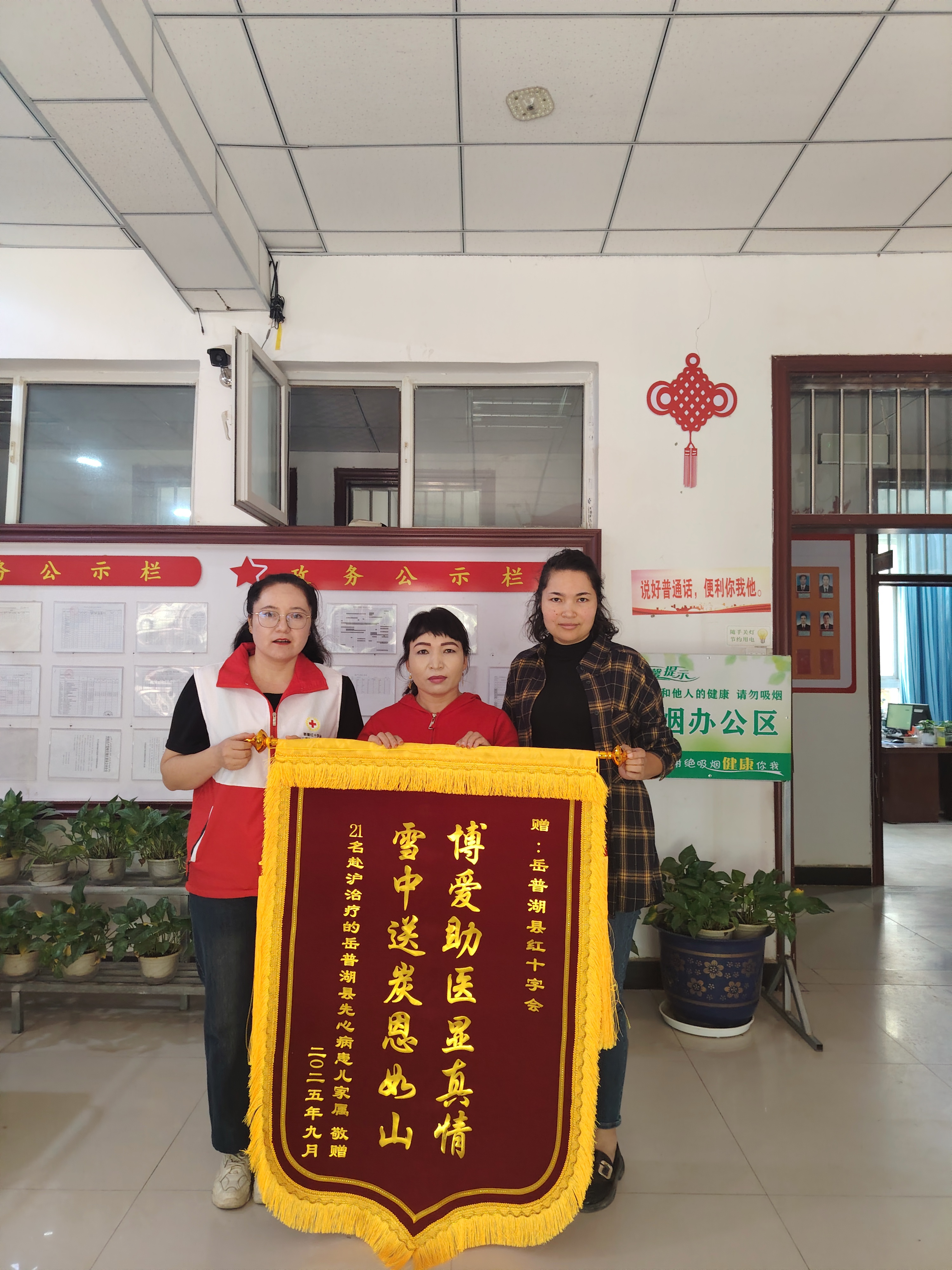 9月28日,曾赴上海接受先天性心脏病治疗的21名患儿家长代表,怀揣着背后21户家庭的满满心意,将一面镌刻着“博爱助医显真情,雪中送炭恩如山”的锦旗送至岳普湖县红十字会,以此集中表达全体受益家庭对红十字会的诚挚谢意。