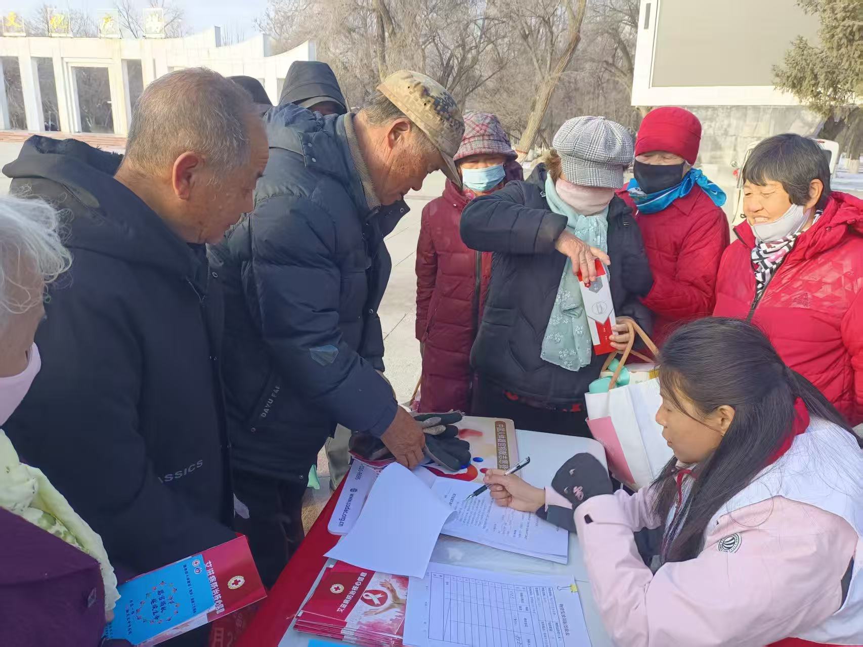 塔城地区托里县红十字会联合县卫健委、疾控中心等单位,在腾龙广场开展艾滋病防治主题宣传活动,红十字志愿者与医护人员分工协作,向过往群众发放艾滋病防治手册、宣传折页等资料,用通俗易懂的语言讲解艾滋病的传播途径、科学预防方法及“四免一关怀”惠民政策,重点澄清“日常接触传染”等认知误区,引导群众消除歧视、科学防控。疾控中心专业人员为有需求的群众提供艾滋病快速检测服务,全程注重隐私?;?,让群众安心便捷地了解自身健康状况。