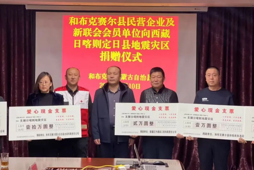 西藏日喀则市定日县6.8级地震之后,和布克赛尔县民营企业家以“一方有难、八方支援”的传统美德和中华民族团结互助、无私奉献的大爱精神,通过和布克赛尔县红十字会向灾区捐款23.8万元,用实际行动诠释了“中华民族一家亲”的深厚内涵。在捐赠仪式上,县委分管领导代表县委、政府对社会各界民营企业及新联会会员单位对西藏灾区援助工作表示感谢,并组织参会的民营企业家合影留念。