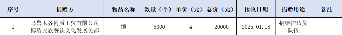 2025年 1月18日,塔城地区红十字会收到爱心企业捐赠香馕5000个,定向捐给塔城地区护边员队伍,现予以公示。