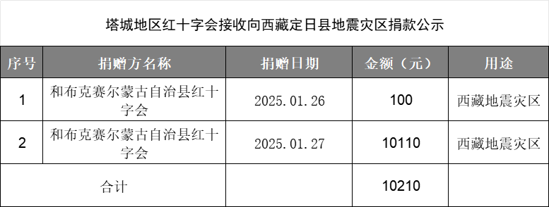 自2025年1月26日-2月4日,塔城地区红十字会累计接收社会各界爱心人士、团体、企业向西藏地震灾区捐款10210元,现予以公示。