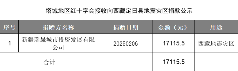 自2025年2月5日-2月11日,塔城地区红十字会累计接收社会各界爱心人士、团体、企业向西藏地震灾区捐款17115.5元,现予以公示。