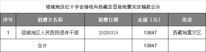 自2025年2月11日-4月22日,塔城地区红十字会累计接收社会各界爱心人士、团体、企业向西藏地震灾区捐款13847元,现予以公示。