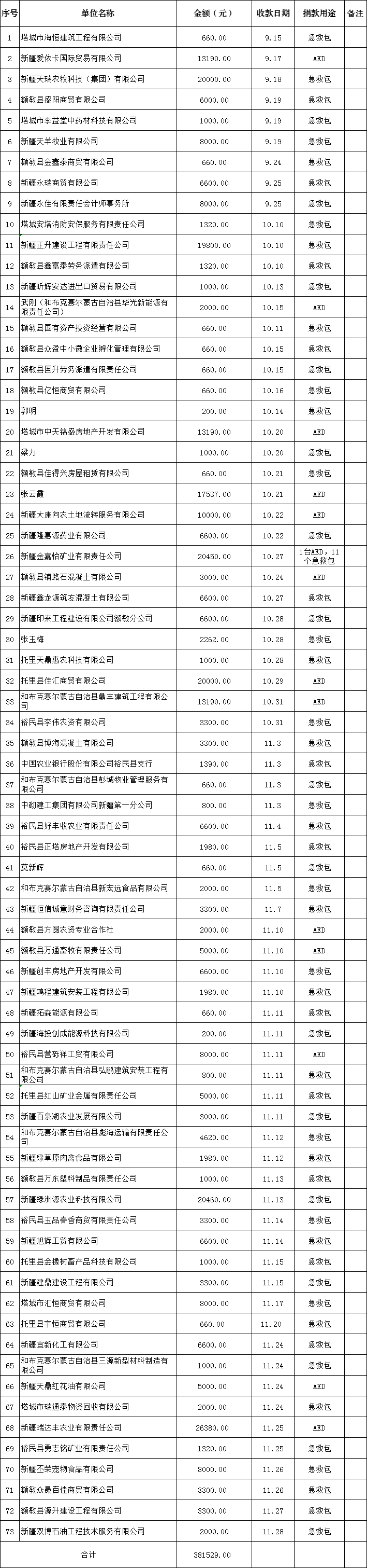 2025年9月1日“久久公益节”众筹项目捐款启动后,塔城地区红十字会参与共建了新疆维吾尔自治区红十字基金会推出的“急救计划AED”、“急救计划急救包”、“博爱送万家”3个项目,开展筹资活动。截止2025年11月30日,共筹集资金383484.57元,其中线下捐款381529元,线上捐款1955.57元。筹集资金已转入新疆维吾尔自治区红十字基金会账户,将用于采购AED、急救包、博爱送万家物资。现将捐款明细公示如下: