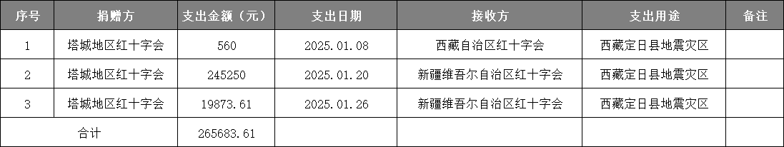2025年1月7日-1月25日,塔城地区红十字会累计接收社会各界爱心人士、团体、企业向西藏地震灾区捐款265683.61元,其中,560元直接转至西藏自治区红十字会账户,265123.61元按照新疆维吾尔自治区红十字会统一安排部署,由新疆维吾尔自治区红十字会汇总后统一转往地震灾区,现予以公示。