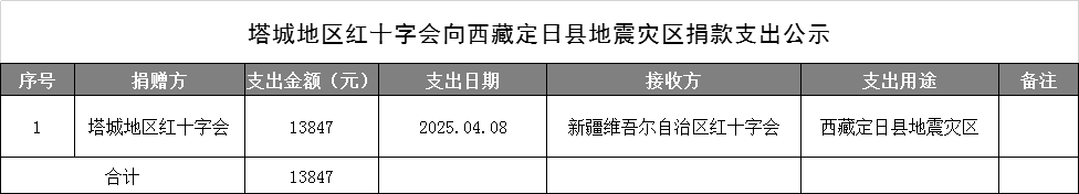 自2025年2月11日-4月22日,塔城地区红十字会累计接收社会各界爱心人士、团体、企业向西藏地震灾区捐款13847元,按照新疆维吾尔自治区红十字会统一安排部署,由新疆维吾尔自治区红十字会汇总后统一转往地震灾区,现予以公示。