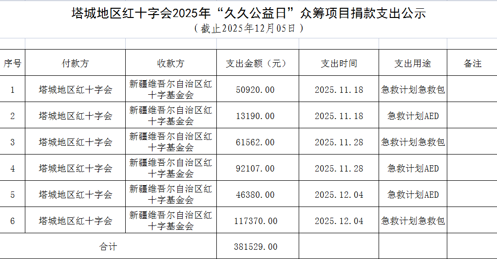 截止2025年11月30日,塔城地区红十字会参与共建的新疆维吾尔自治区红十字基金会推出的“急救计划AED”、“急救计划急救包”、“博爱送万家”3个项目,共筹集资金383484.57元。其中,线下捐款381529元,已全部转入新疆维吾尔自治区红十字基金会账户,线上捐款二维码关联账户为新疆维吾尔自治区红十字基金会账户,1955.57元捐款已直接进入该账户。所有捐款资金将用于采购AED、急救包、博爱送万家物资。现将捐款支出情况公示如下: