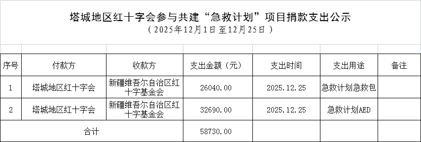2025年12月1日至12月25日,塔城地区红十字会参与共建的新疆维吾尔自治区红十字基金会携手推出的“急救计划AED”,“急救计划急救包”,“博爱送万家”3个项目共筹集资金  58730元,已全部转入新疆维吾尔自治区红十字基金会账户,所有捐款按照项目资金用途采购物资。现将捐款支出情况公示如下: