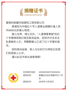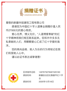 近日,吐鲁番市红十字会向新疆华挺建筑工程有限公司发放捐赠证书,感谢其通过“博爱通”向市红十字会捐赠100件棉大衣和棉被、褥子、被套、床单各150件,加强了市红十字会救灾备灾物资储备,并对其长期以来支持全市红十字系统工作,在“红十字博爱送万家”“5·8人道公益日”和2025年支援西藏定日县抗震救灾期间一起弘扬人道主义、体现民族团结一家亲的爱心义举表达了诚挚的谢意。