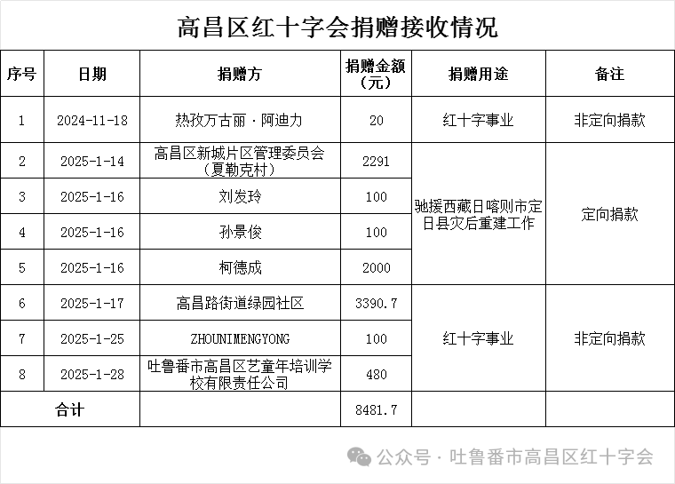 备注:定向捐款4491元已于2025年2月12日转入吐鲁番市红十字会账户,并将通过自治区红十字会拨付至西藏红十字会;非定向捐款3990.7元将用于高昌区红十字事业发展,并将及时向社会公开使用情况,接受群众监督。如有异议,请向高昌区红十字会反馈,我们将及时核实更正(联系热线:0995-8621120)。