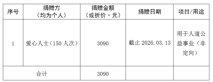 截止2026年3月13日,市红十字会通过“博爱通”接收社会个人爱心捐款150人次3090元,现予以公示。