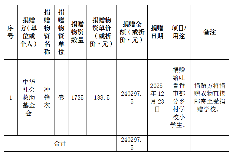 202512月,吐鲁番市红十字会接收中华社会救助基金会捐赠的1735套御寒冬衣(冲锋衣),定向捐赠给全市3个区县部分乡村学校小学生,折合人民币共计240297.5元人民币。