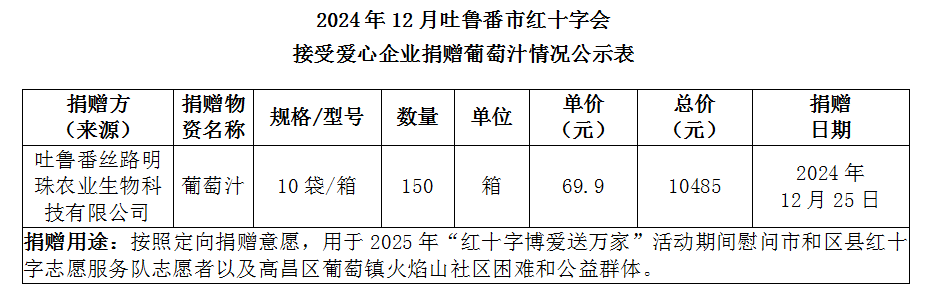 2024年12月,吐鲁番市红十字会接受吐鲁番丝路明珠农业生物科技有限公司自愿捐赠的葡萄汁150箱(每箱10袋)、价值10485元(每箱69.9元),按照定向捐赠意愿,将用于2025年“红十字博爱送万家”活动期间慰问市和区县红十字志愿服务队志愿者以及高昌区葡萄镇火焰山社区困难和公益群体。