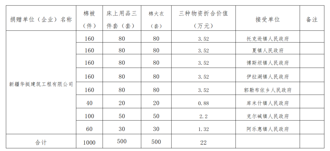 近日(截至2025年2月6日),托克逊县红十字会接受新疆华挺建筑工程有限公司1批合计价值22万元人民币的捐赠物资。其中:棉被1000条、价值人民币100000元单价100元/条),床上用品三件套500套、价值人民币50000元(单价100元/套),棉大衣500件、价值人民币70000元单价140元/件。以上物资已分发到托克逊县8个乡镇,将用于救助乡镇辖区困难群体。现依法依规公示所接受捐赠物资和去向情况,接受社会监督。