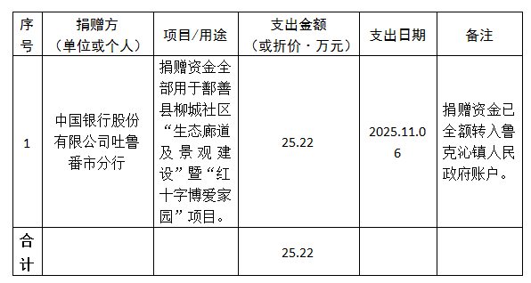 2025年11月6日,中国银行股份有限公司吐鲁番市分行向吐鲁番市红十字会捐款人民币25.22万元,已按定向捐款协议将捐款通过鄯善县红十字会账户全额拨付到鄯善县鲁克沁镇人民政府账户。