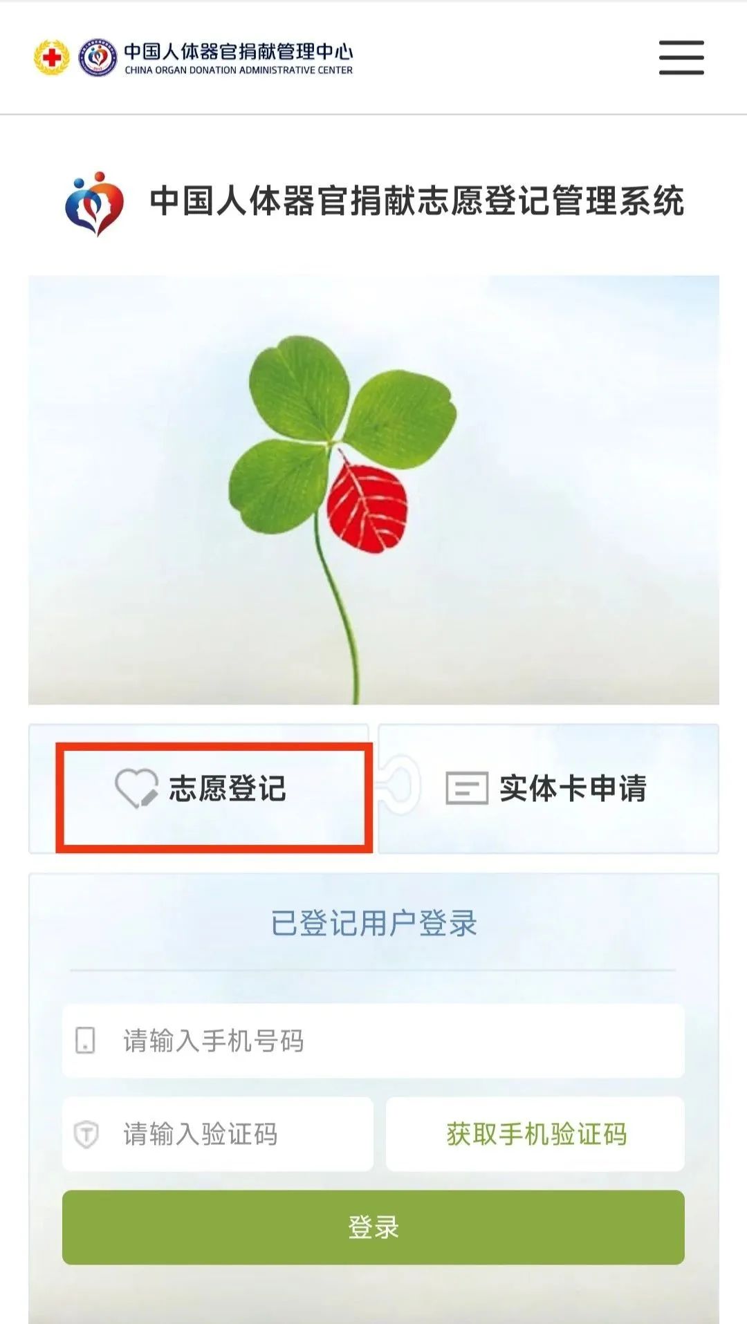 2:进入中国人体器官捐献志愿登记管理系统后,点击“志愿登记”。