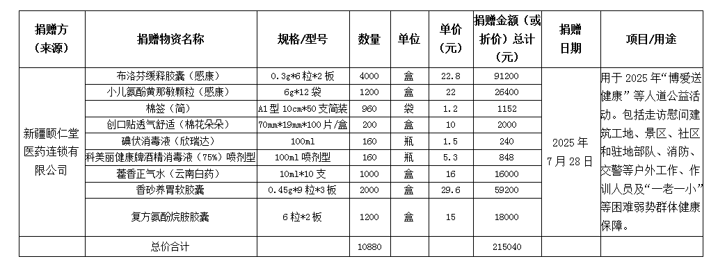 2025年7月,吐鲁番市红十字会接收新疆颐仁堂医药连锁有限公司捐赠的一批价值215040元的药品物资,按照捐赠意愿,将用于2025年“博爱送健康”等人道公益活动。
