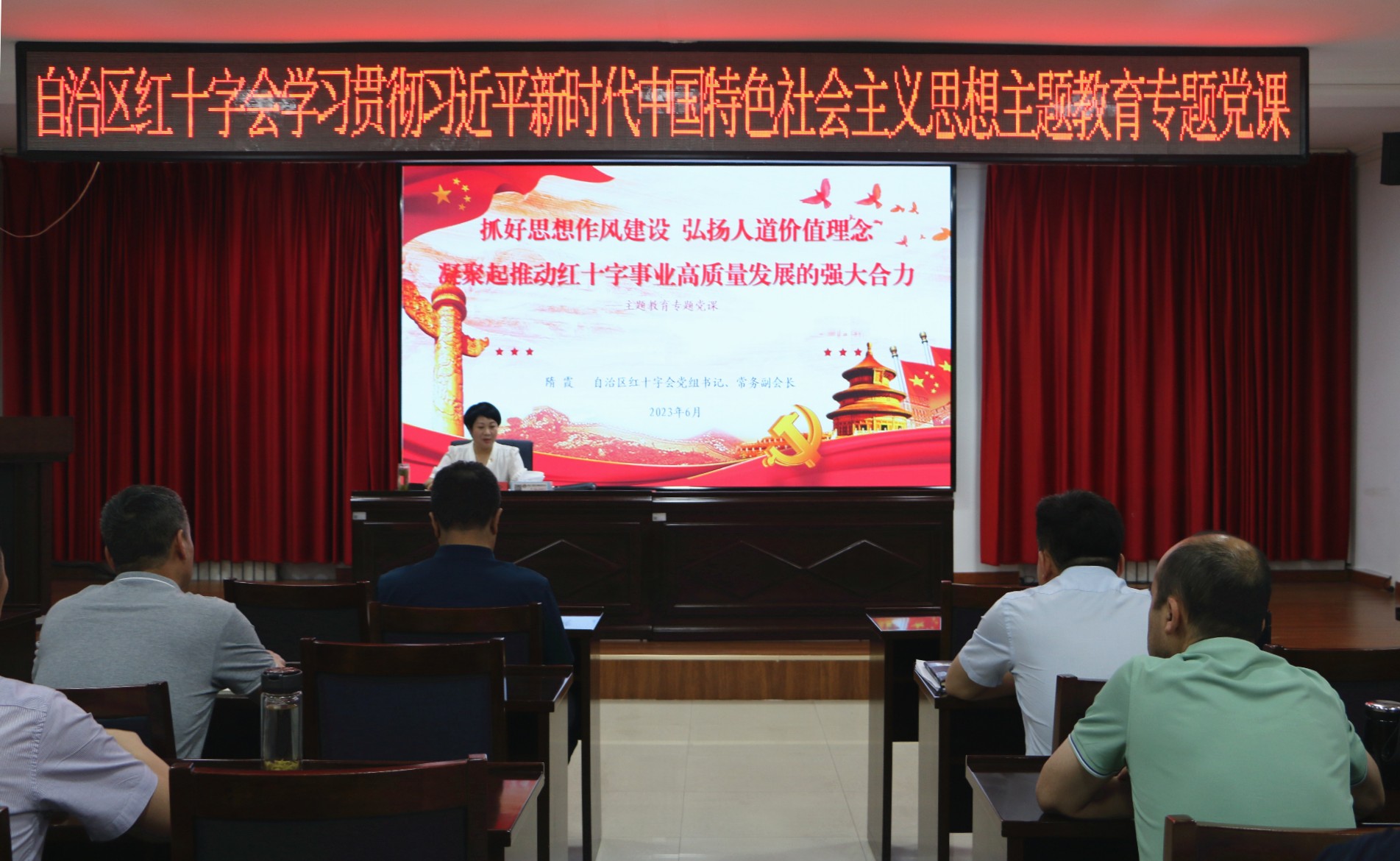 为推动学习贯彻习近平新时代中国特色社会主义思想主题教育走深走实,按照主题教育工作部署,6月13日,自治区红十字会党组书记、主题教育领导小组组长隋霞以《抓好思想作风建设 弘扬人道价值理念 凝聚起推动红十字事业高质量发展的强大合力》为题作专题党课辅导,引导会机关党员干部深入学思践悟习近平新时代中国特色社会主义思想,牢牢把握“学思想、强党性、重实践、建新功”的总要求,以学铸魂、以学增智、以学正风、以学促干,为推动新疆经济社会高质量发展贡献红十字会力量?;峄厝宓吃备刹坎渭友?。