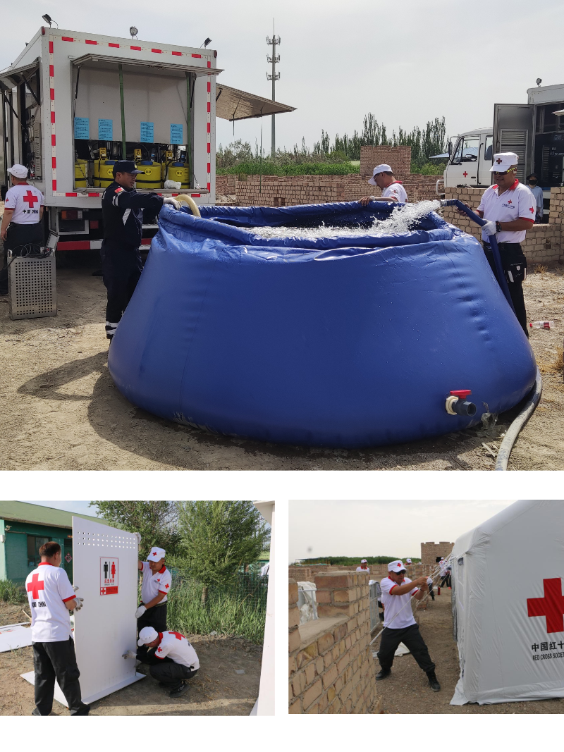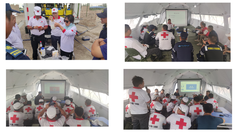 演习现场,模拟地震造成大量房屋倒塌、人员被困等次生灾害频发,同时,还面临着受灾群众安置点的水质安全、卫生防疫、安抚受灾群众情绪等问题。为应对这些问题,自治区红十字会在受灾群众集中安置点建立工作营地,新疆大众卫生救援队、新疆供水救援队、医疗救援队、赈济救援队、云南省红十字医疗救援队、云南省红十字供水救援队、云南省红十字大众卫生救援队、吉林省红十字医疗救援队、吉林省红十字赈济救援队、兵团红十字医疗救援队等10支队伍进驻营地,紧张有序地搭建安置帐篷和应急卫生厕所,展开并运行移动设备净化水质,在紧急情况下快速解决受灾群众如厕和生活用水等难题。同时,在灾区群众中进行疫病防治知识普及,提供应急救护知识技能培训。全体队员们战风雨、冒风沙、顶着将近40℃的高温天气,忍受着蚊虫的叮咬,没有一个人退缩,通过大家共同的努力,最终圆满完成了任务。