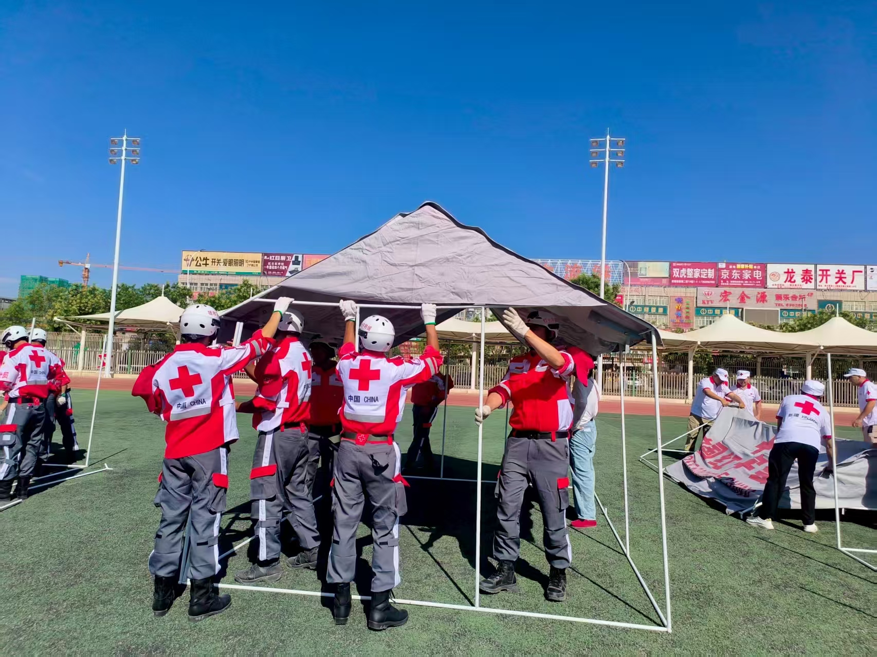 救援队正在进行搭建营地帐篷